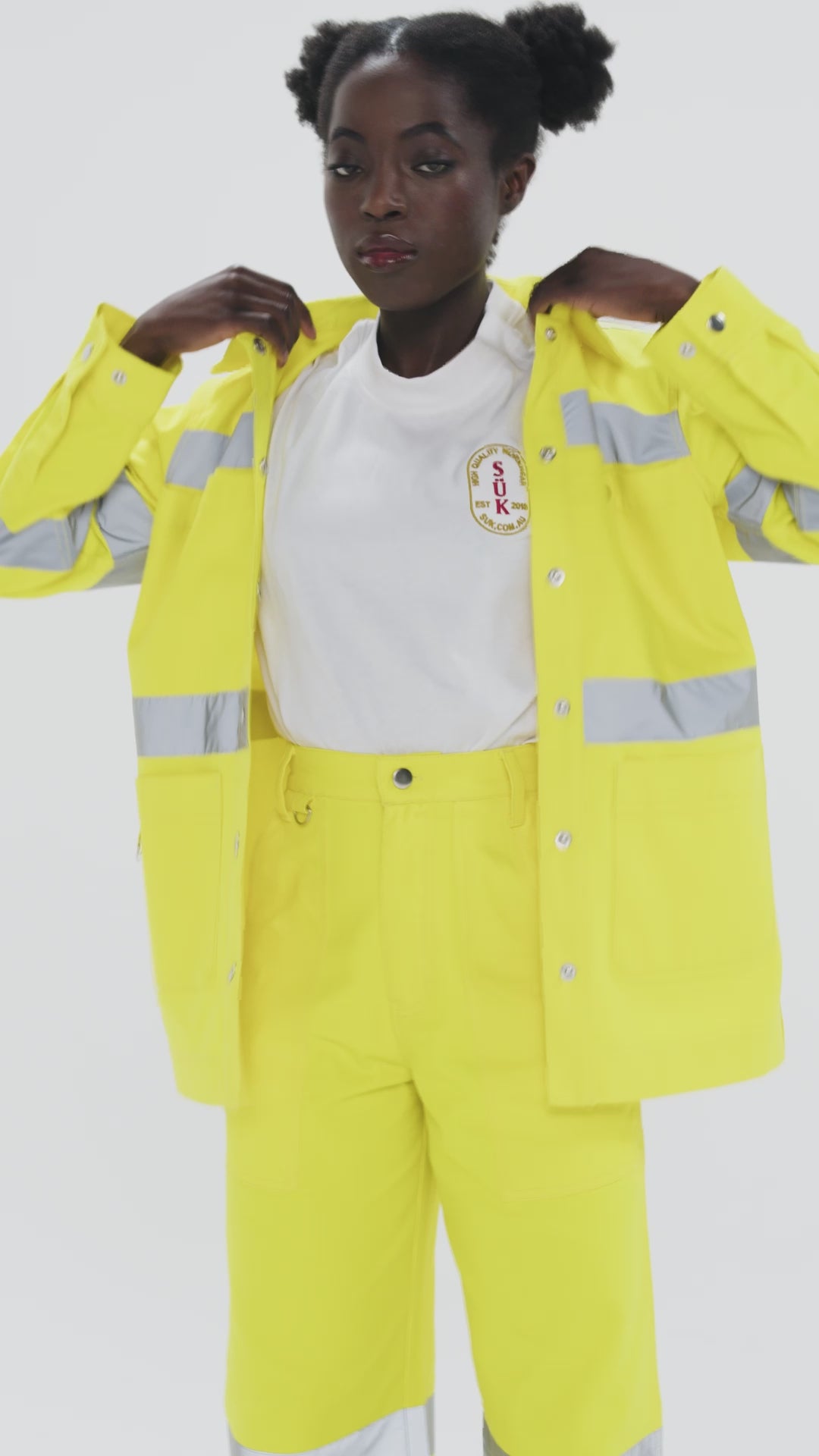This worker's jacket is crafted from hi-visibility, water repellent canvas fabric. Like all our hi-vis range, it's made from 100% Fairtrade cotton—a rarity in the workwear world. We love natural fibres for their breathability and recyclability. Now, whether you're on-site, on the road, or at a rave, you can be assured you're wearing something that's kind to the environment.