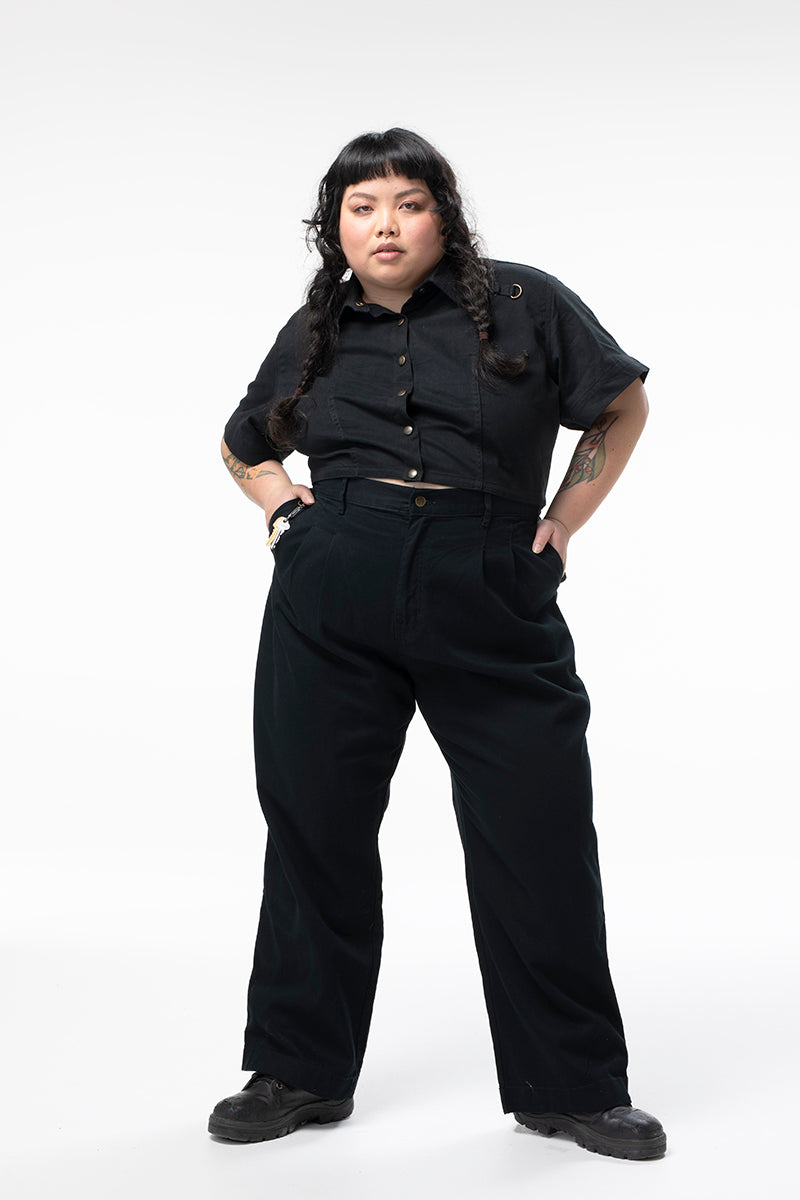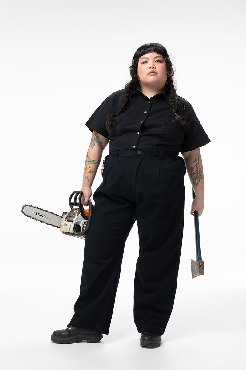 A unique utility shirt with wide sleeves, spacious bust and streamlined to the waist. This shirt is flattering and functional with a pen or tool holder and a d-ring attachment for extra accessories.