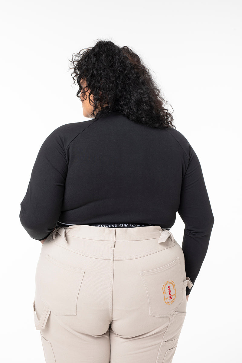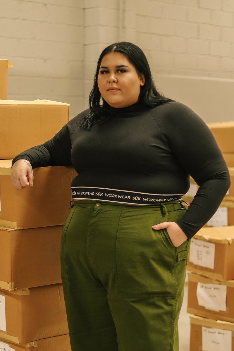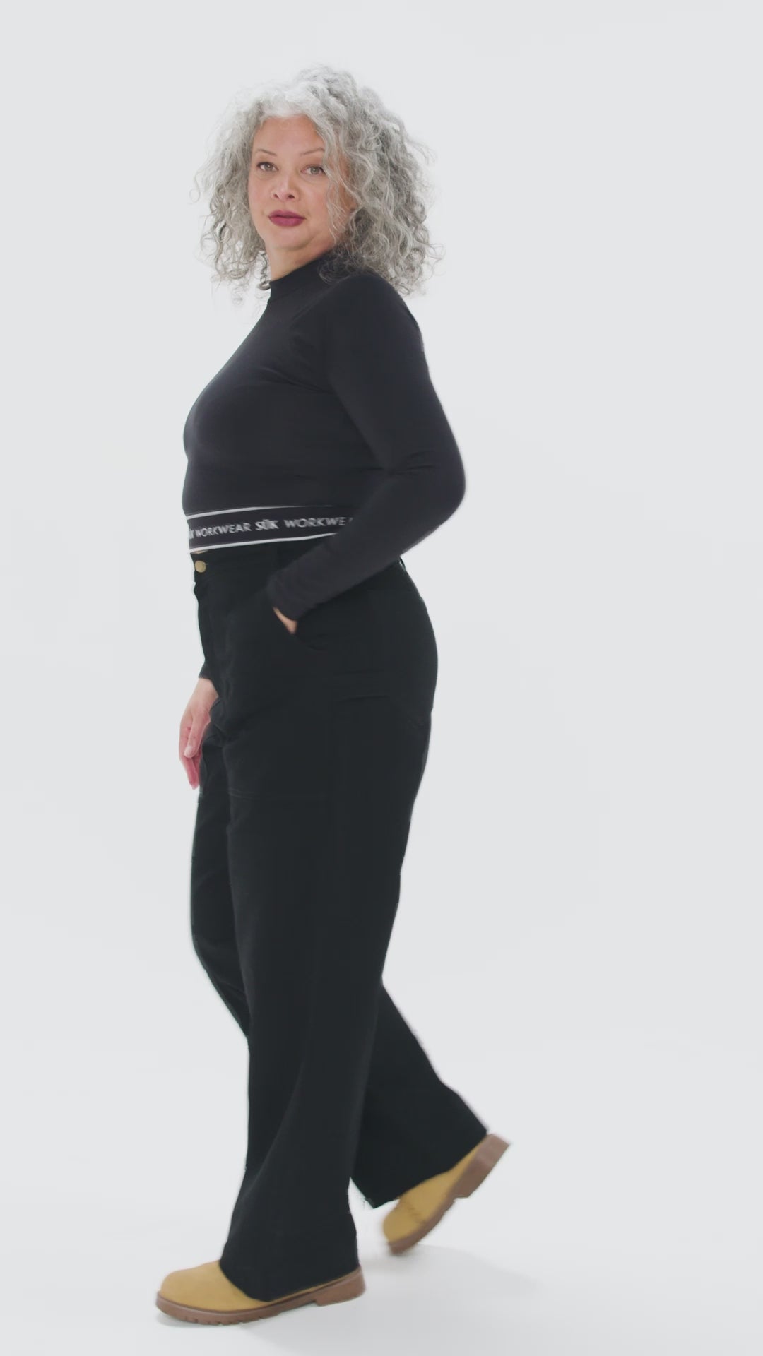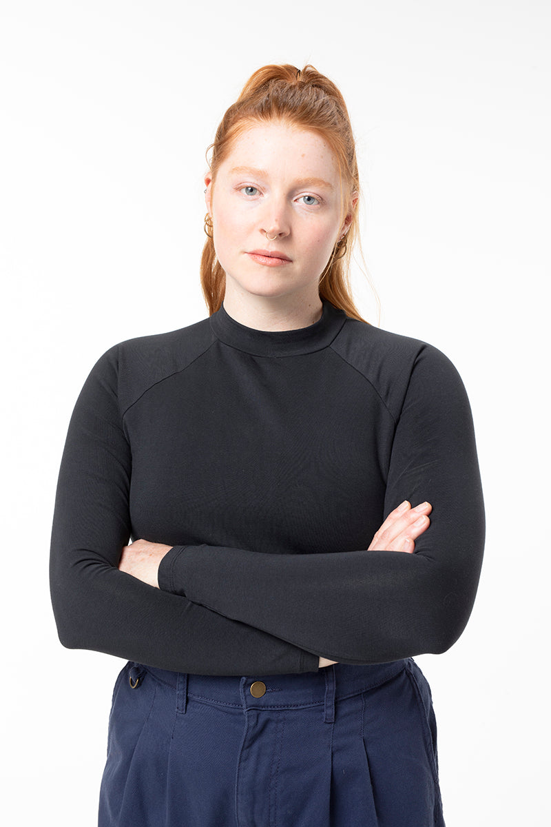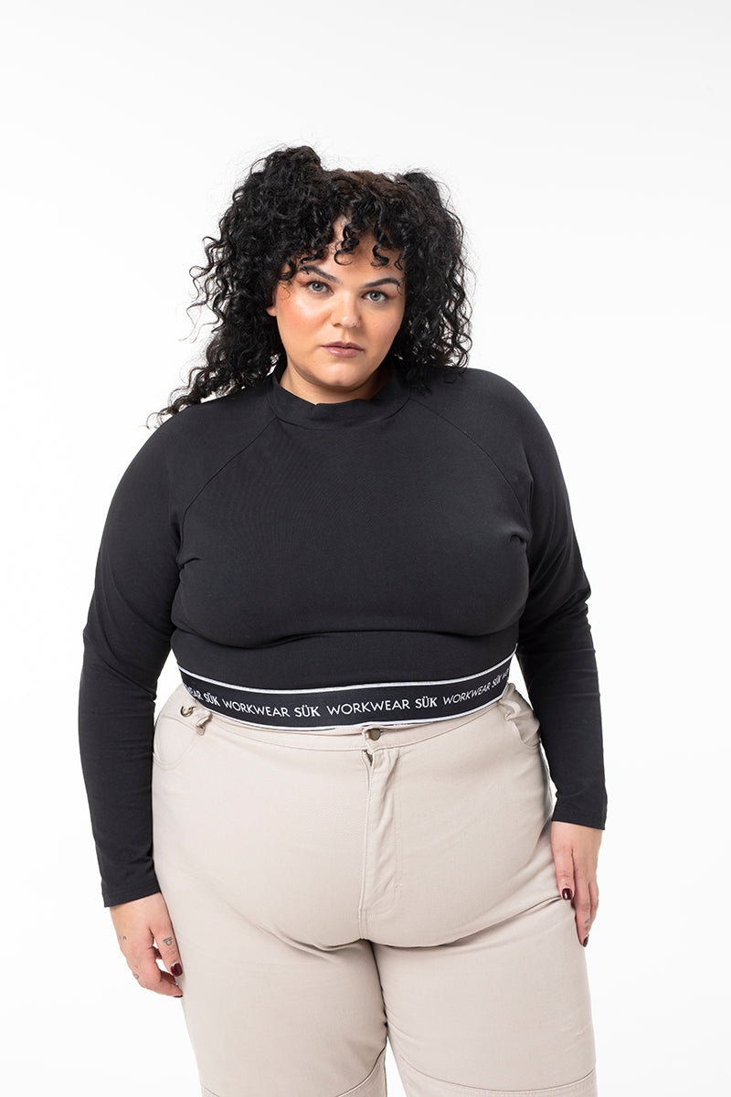 Perfect for the cooler months or for providing full arm coverage AND next level bust support. This crop top has a raglan sleeve and a little bit of stretch for full arm movement. With a high neck to fit comfortably under our overalls, it's designed to finish just above the waist.