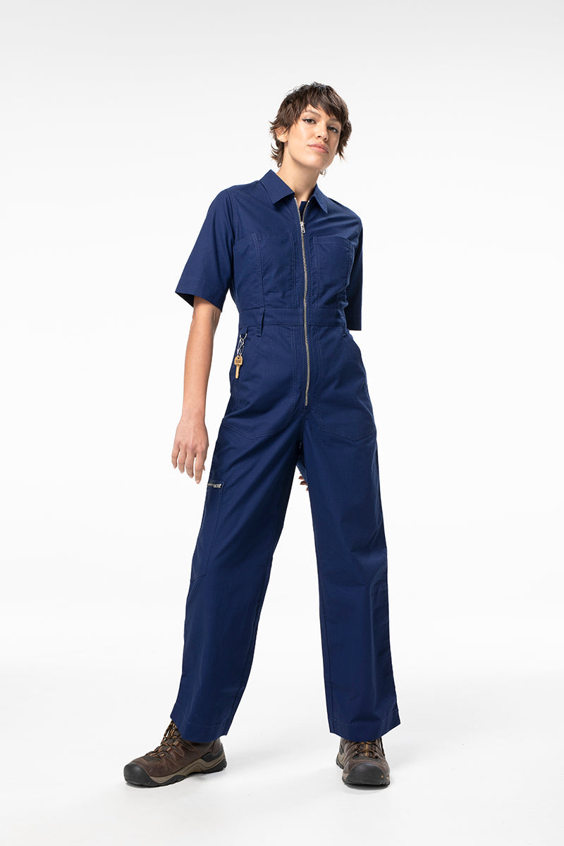 We recommend sizing up in our Ripstop fabric. Our classic drill fabric gives with washing and wearing, and our lightweight Ripstop will hold its shape. So if your SÜK size in Drill is 16, we recommend a size 18 in Ripstop. A lightweight and durable full trousered suit with a cropped sleeve is made for excellent sun protection, hard work and looking GOOD. We have combined several of your favourite design features in this style: A long front zip & large back waist adjuster for that satisfying feeling of zipping up and strapping down. We’ve also added a zippable leg pocket, hammer holster & a slightly longer arm sleeve for comfortable coverage and a slick look.