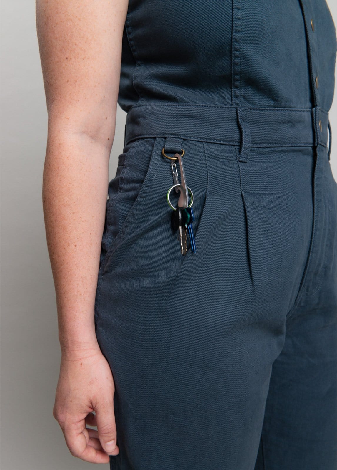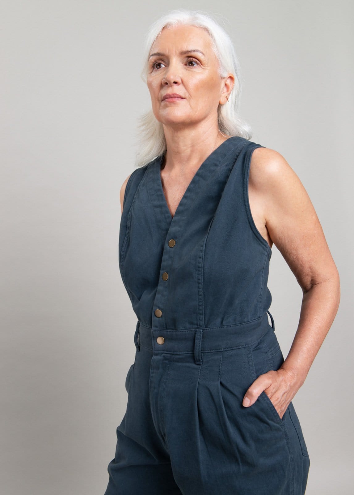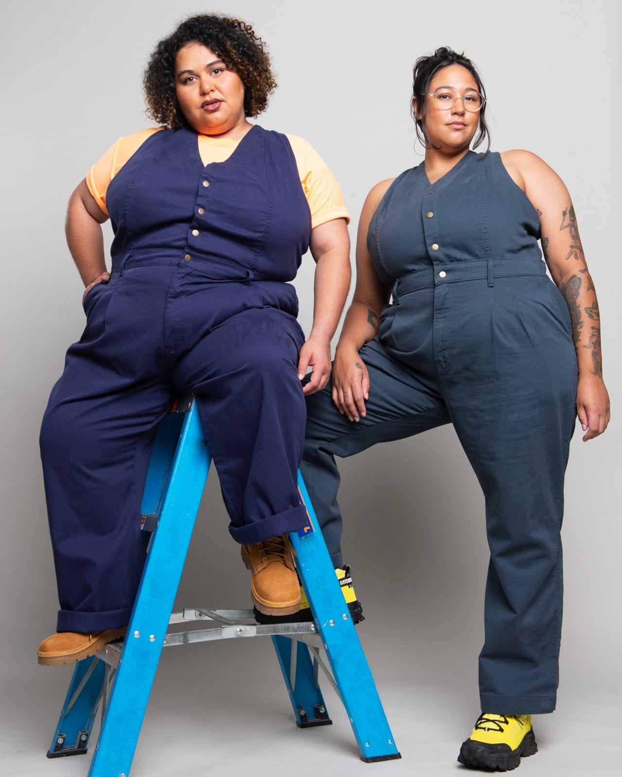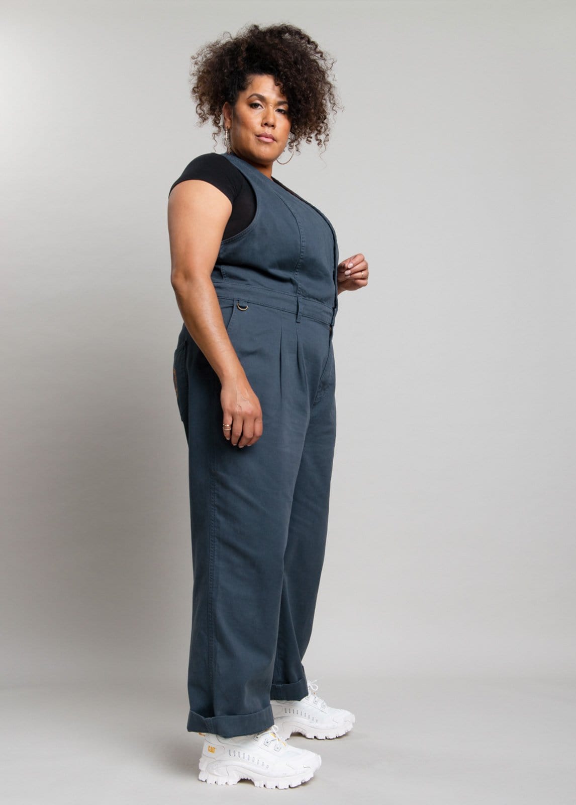 Our take on a workwear staple. The front-opening princess line seam allows for a firm fit around the bust, while the relaxed leg gives free movement. The 100% cotton fabric is breathable in summer and can easily be layered in cooler months. Back straps are adjustable, adapting to people of various heights.