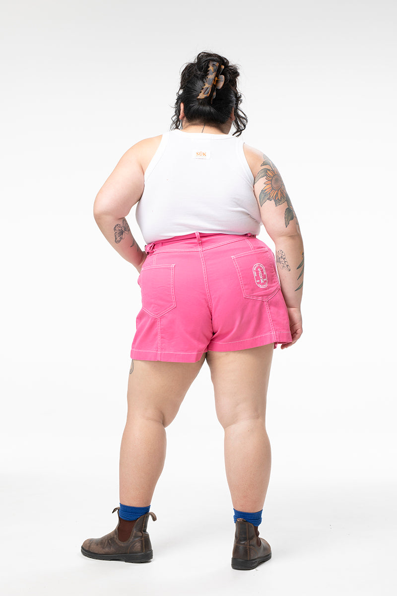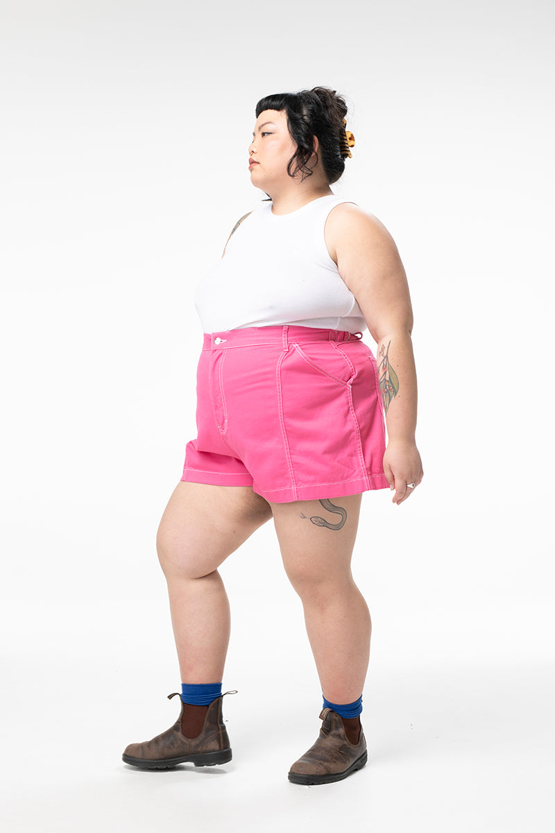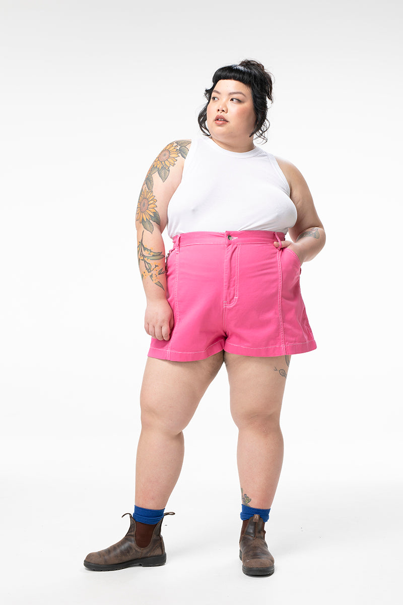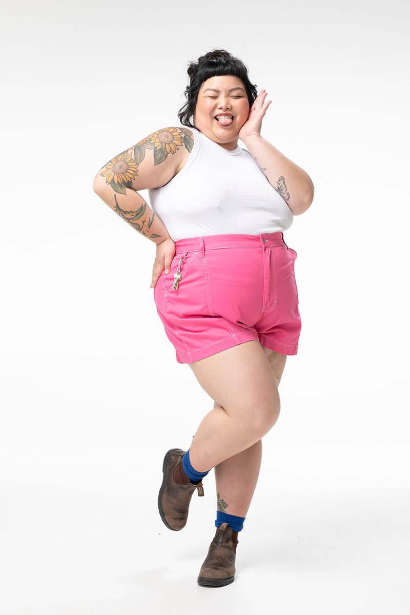 They're back! And better than ever. Our take on a nostalgic work short, these shorter shorts are made to fit high on the waist, and give room for movement through the thigh. The Tinnie Shorts are the quintessential, feminine work shorts that you can take on site or into the party. Finally, a pair of short shorts made with real bodies in mind.